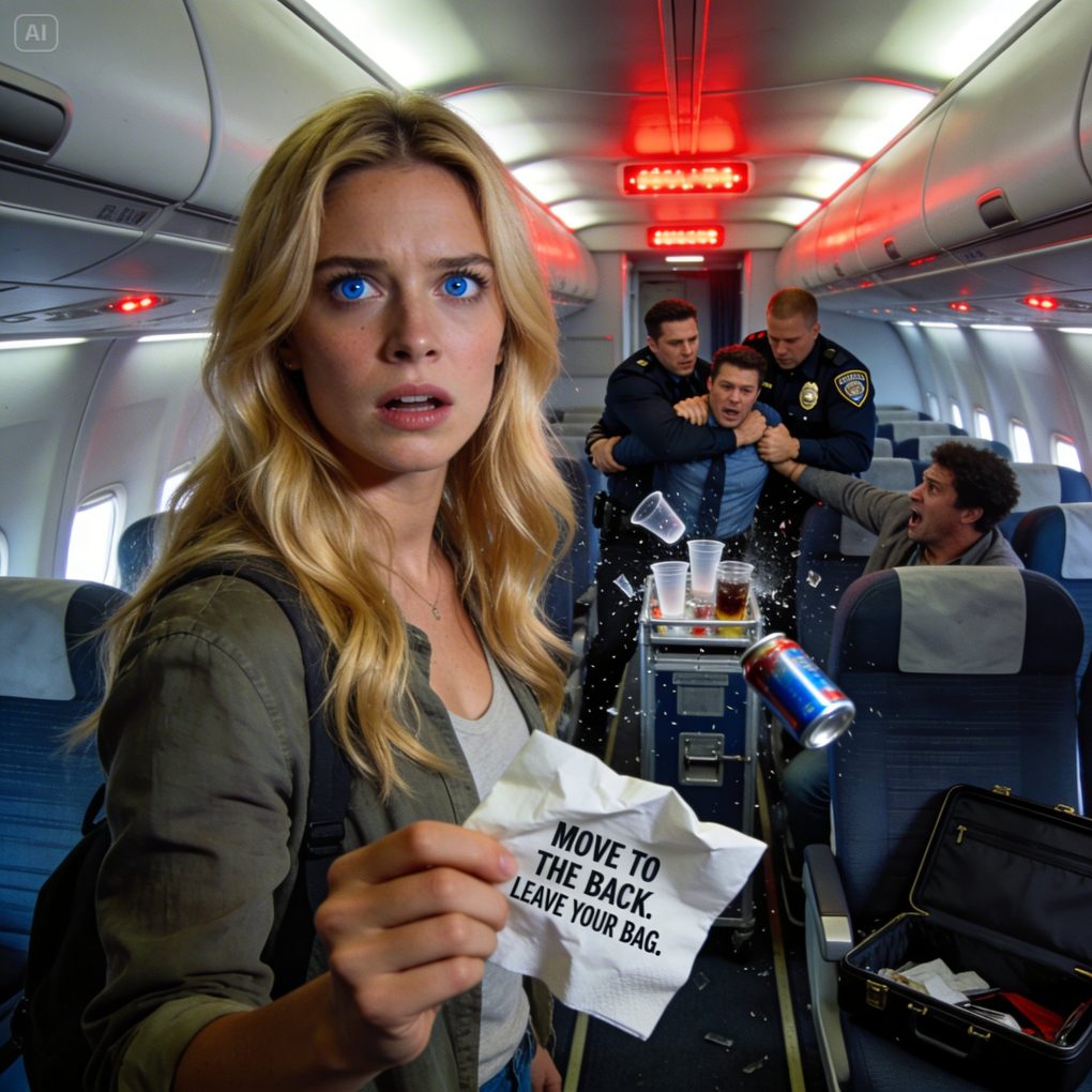 Part 1: The Drink I Didn’t Order The flight attendant handed me a cup of water I hadn’t asked for. Tucked beneath it was a napkin folded twice. I almost set it on the tray table without looking. My name is Lauren Mitchell, I was flying from Boston to Dallas for a client meeting, and I had chosen seat 12A specifically for the window view. When I unfolded the napkin, my breath caught. Move to the back. Leave your bag. Do not argue. I looked up immediately. The attendant, a blonde woman with calm blue eyes—her tag read Erin—was smiling as she served the row ahead of me. When she reached my seat again, I whispered, “Why?” She leaned down slightly, voice barely audible. “Trust me. Go now.” My heart began pounding so hard I could feel it in my throat. I glanced at the man seated beside me in 12B. He was mid-thirties, clean-cut, wearing a navy blazer despite the casual flight. He hadn’t spoken much since boarding, but he kept one hand on the carry-on beneath his seat, fingers tense around the zipper. “Everything okay?” he asked when I unbuckled my seatbelt. “Just need the restroom,” I said lightly. I stood, leaving my tote bag under the seat as instructed, and walked down the aisle, resisting the urge to hurry. I felt exposed, vulnerable, every step deliberate. When I reached the rear galley, Erin positioned herself between me and the cabin, her expression suddenly serious. “Stay here,” she said quietly. Seconds later, two men who had been seated separately stood at once and moved toward Row 12. One reached inside his jacket. The other grabbed the man in 12B by the shoulder. The cabin erupted into confusion. The man lunged for his bag. A sharp metallic clatter echoed as something hit the floor. Passengers screamed. And in that instant, I realized the seat I had just vacated was the center of whatever was about to unfold.