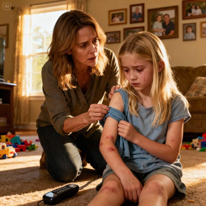 The evening sunlight was fading when Emily Carter, a single mother living in a quiet suburban neighborhood in Ohio, noticed something odd. Her twelve-year-old daughter, Sophie, was unusually quiet, refusing to sit at the dinner table. Emily had been rushing between her job at the hospital and household chores, but she finally slowed down and really looked at her daughter. That’s when she saw it: faint bruises on Sophie’s arms, just beneath the sleeve of her T-shirt.