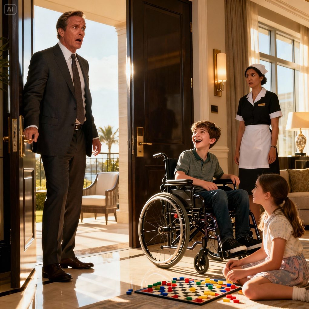The billionaire father came home early and was stunned to see his disabled son laughing joyfully with the maid’s daughter — a moment that changed everything…