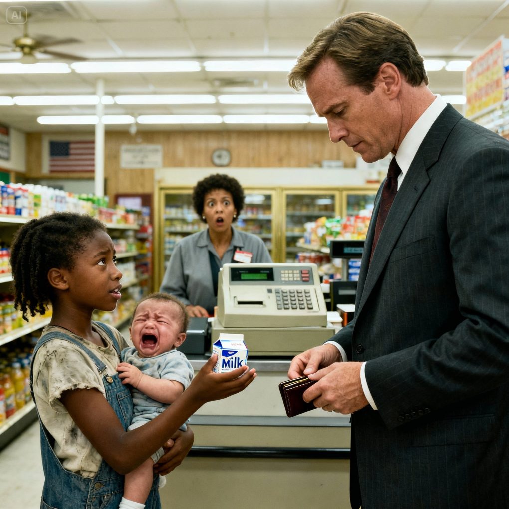 Inside the store, a tall man in an expensive suit was talking to the cashier. His name was Richard Morgan, a millionaire businessman who owned a chain of stores across Georgia. Keisha approached him shyly, her voice shaking. “Sir, please… my baby brother is hungry. Could I please have a box of milk? I promise I’ll repay you when I grow up.”