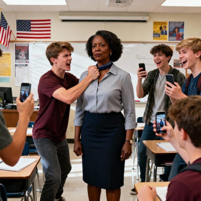 A group of racist students grabbed a Black teacher by the collar and insulted her in class — not knowing she was a former Navy veteran with a fierce reputation….