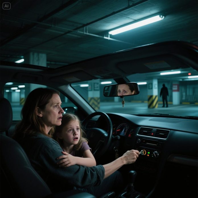 In the underground parking garage of the mall, my daughter suddenly grabbed my hand tightly. “Mom, don’t start the car!” I froze, the key still in my hand. She whispered, “Mom… look in the rearview mirror.” When I looked, my entire body went rigid… because of what I saw.