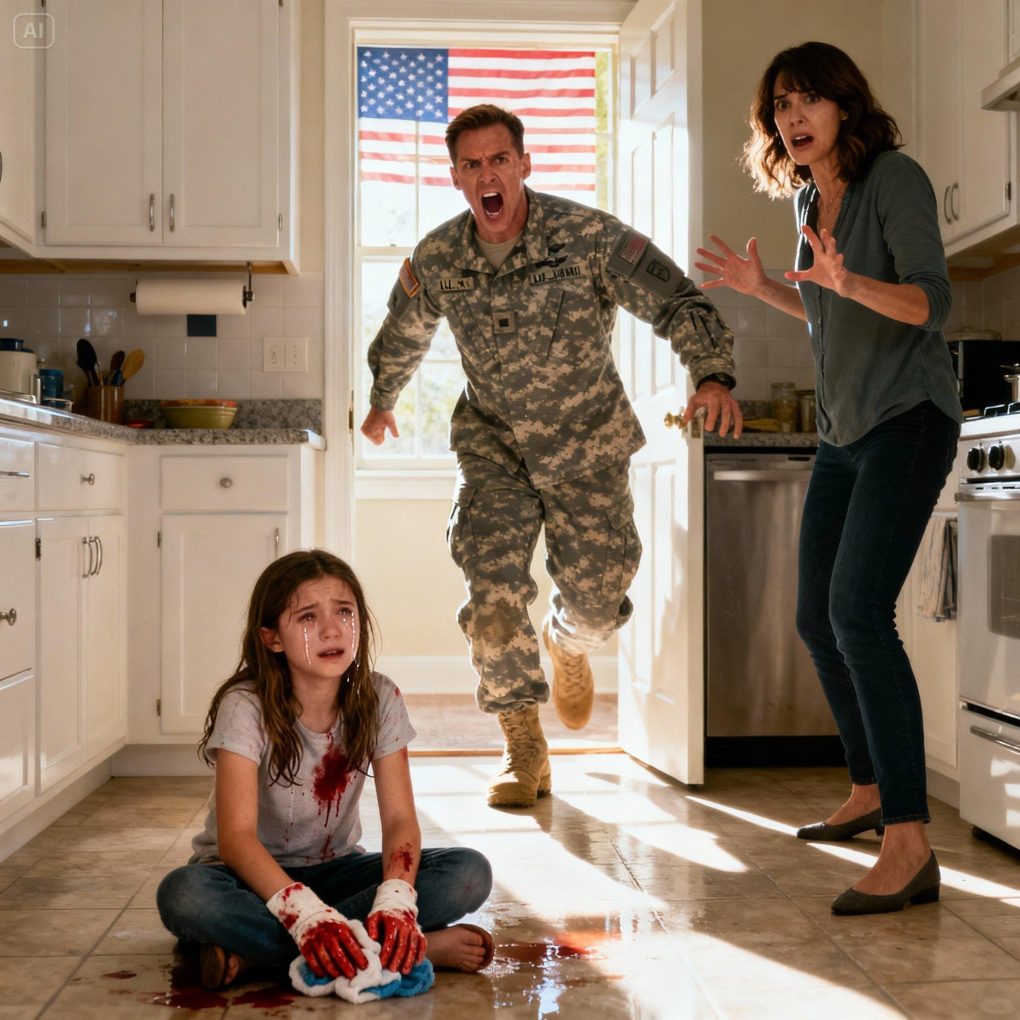 At that exact moment, the sound of a door unlocking echoed through the house. Heavy boots stepped inside. It was Captain James Carter, Emily’s father, returning from his military deployment weeks earlier than expected. He dropped his duffel bag at the sight before him.