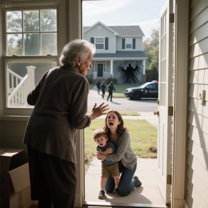 “Don’t move,” the old woman whispered sharply, pulling the curtain back just a fraction. “Don’t let them see you.”
