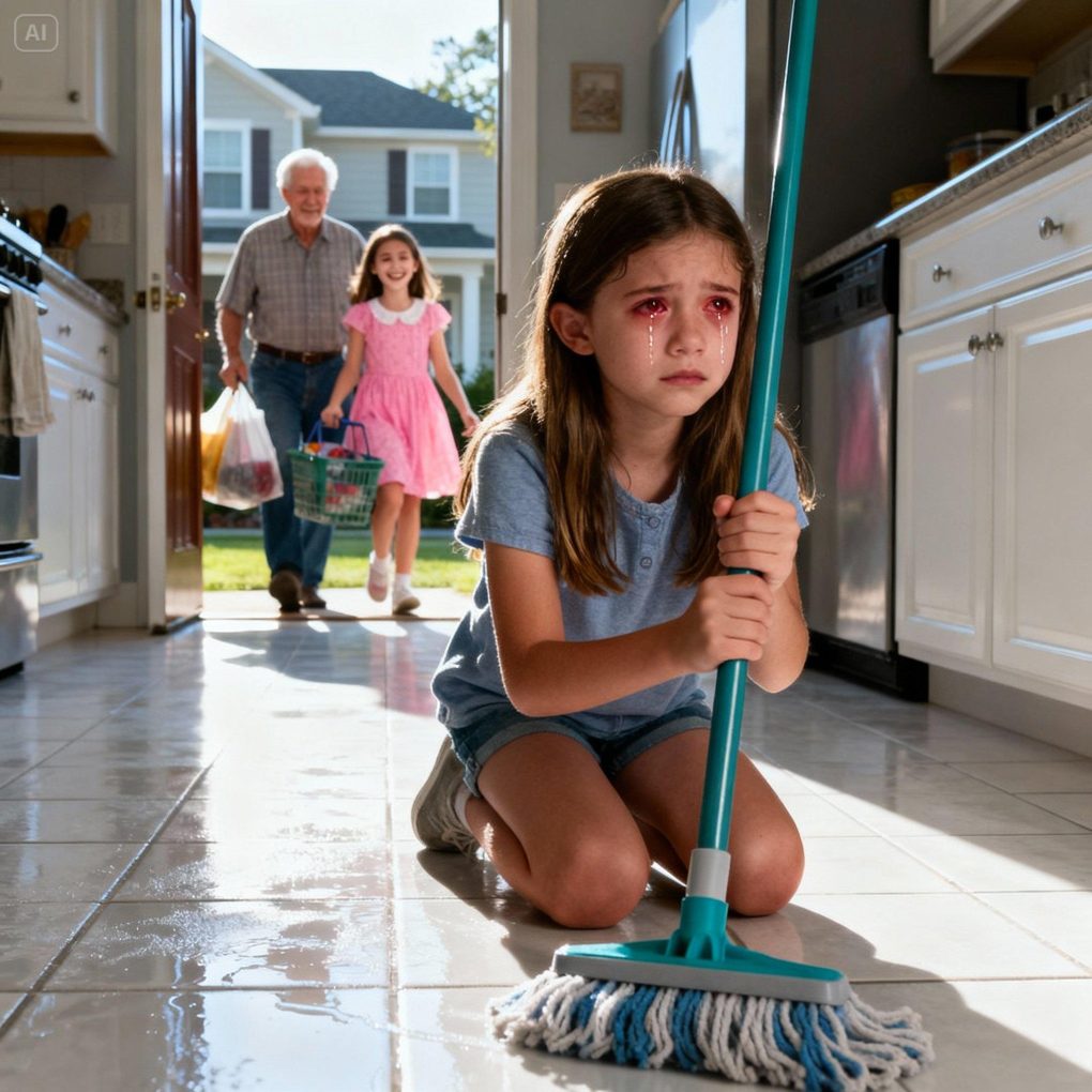 Emily didn’t complain. She dipped the mop into the water, wrung it out with her small hands, and began pushing it across the wooden floor. Her arms ached quickly; the bucket was heavy, and the task seemed endless. She kept glancing at the clock, imagining Sophie at the mall, twirling in new dresses while grandparents cooed over her.