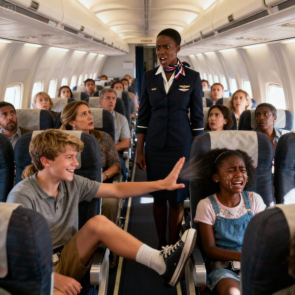 It was supposed to be an ordinary flight from Dallas to New York. The cabin buzzed with quiet chatter and the soft hum of engines as passengers settled in for the three-hour trip. Among them sat twelve-year-old Amira Johnson, a shy Black girl traveling alone to visit her aunt. Behind her was a restless white boy, about ten, named Oliver Parker—accompanied by his mother, Megan Parker, a woman in her late thirties who scrolled through her phone, oblivious to her son’s behavior.
