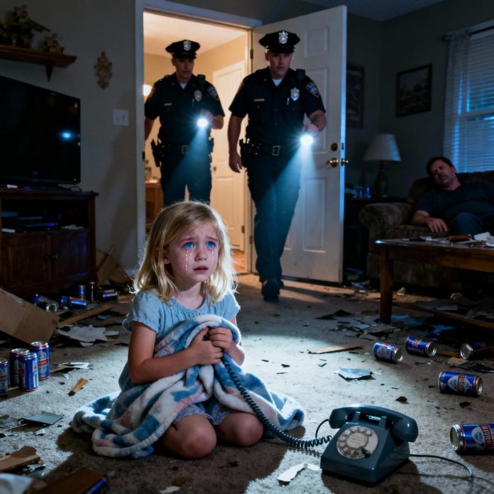 Officers David Ross and Michael Jensen arrived within minutes. The front door was ajar, and faint sobs came from the back room. As they moved carefully through the cluttered living room, they saw signs of neglect—dirty dishes, empty beer cans, and broken furniture. When they reached the hallway, the scene froze them in place.