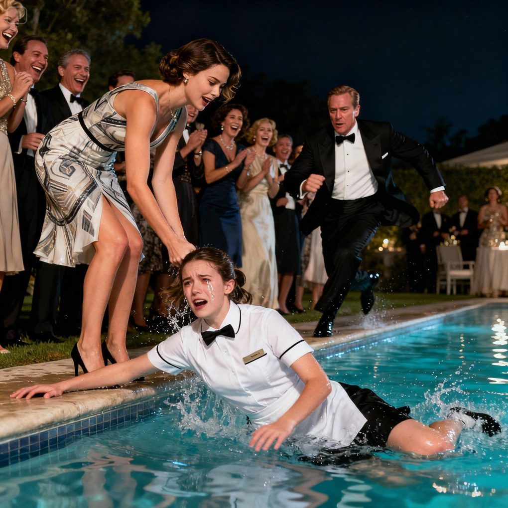 Before Emily could react, Madison shoved her shoulder. The tray of champagne flew into the air, glasses shattered on the pool deck, and Emily plunged backward into the water with a splash.