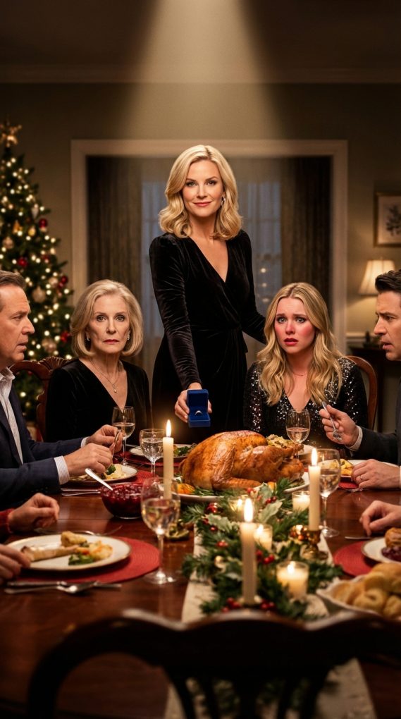 I reached into my pocket and pulled out a small velvet box—midnight blue, worn at the corners from being opened and closed in secret. I placed it on the table, right beside the cranberry sauce, and nudged it toward them.