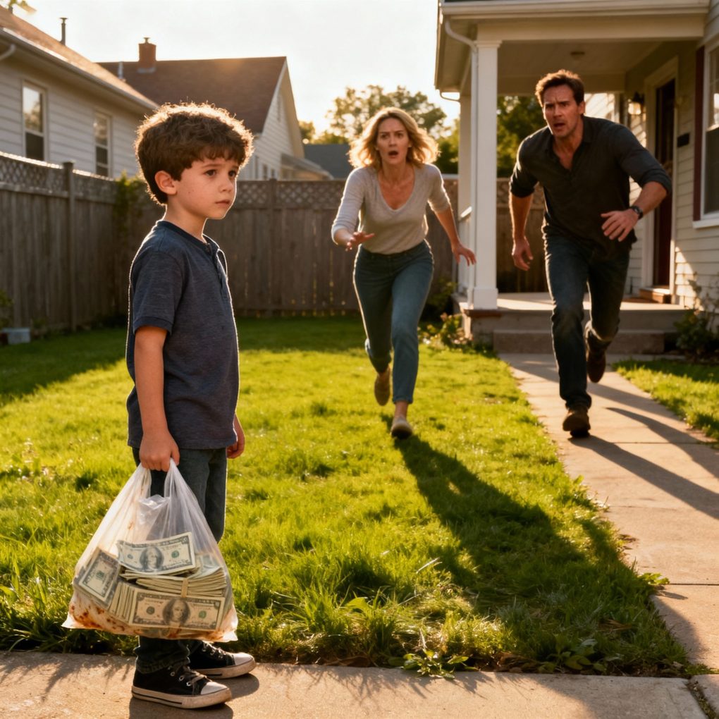 Thirty minutes later, as police sirens neared the end of the street, Oliver appeared—calm, dusty, and clutching a plastic grocery bag. Sarah ran to him, tears streaming down her face. But before she could scold or hug him, Oliver handed her the bag. Inside was a neat stack of hundred-dollar bills. She froze, staring at what looked like a fortune.
