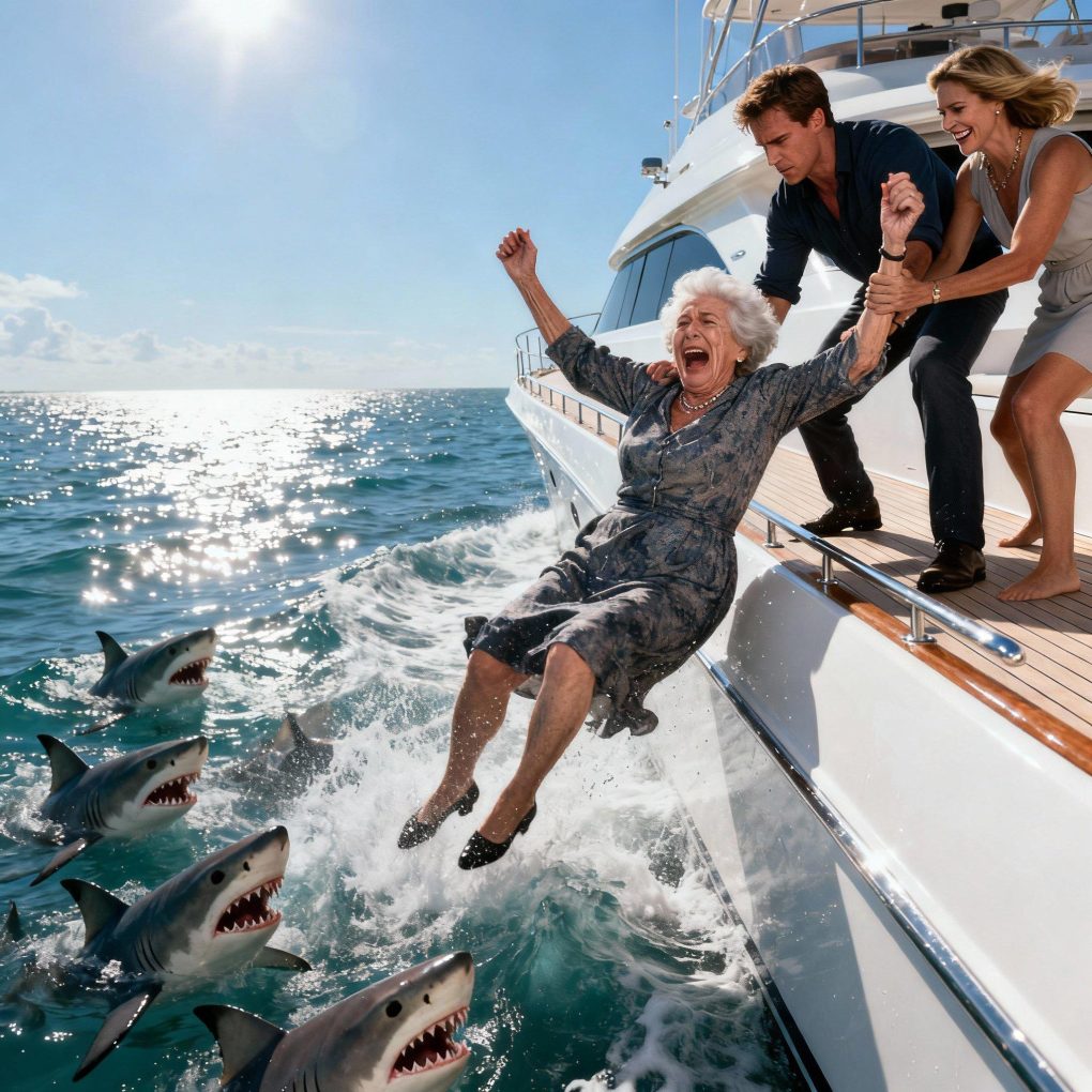 “Time to meet the sharks!” Jason laughed as he shoved his frail mother off the yacht. The old woman screamed, her thin arms flailing in the dark waters below. Beside him, his wife Olivia clutched his arm, her eyes wide but filled with greed rather than guilt. The sound of the waves swallowed Margaret’s cries as she fought to stay afloat. Jason turned away, tossing the empty champagne glass into the ocean.