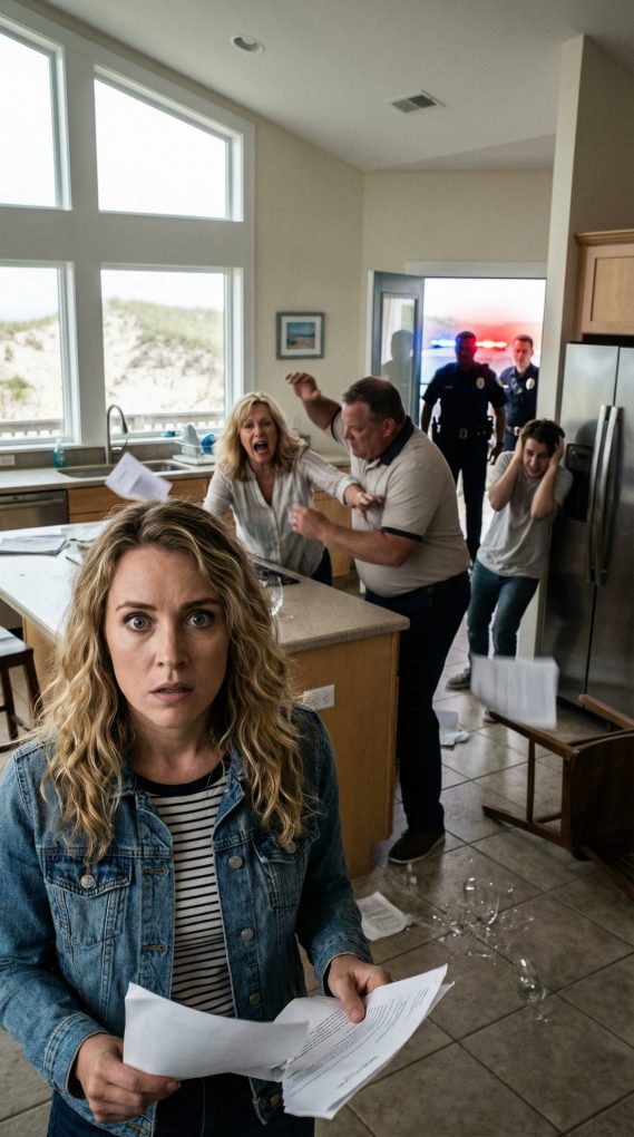 The beach house looked the same—gray shingles, white trim—but the driveway flashed with police lights. Ray’s truck sat crooked near the dunes, and my mother stood on the porch with her arms crossed, as if posture could rewrite paperwork.