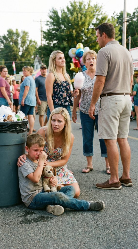 My heart slammed. I pushed through people, calling his name. Then I spotted him two booths down—sitting on the pavement beside a trash can, dust on his knees, eyes glossy with tears he refused to let fall. No adult stood near him. Just Noah, small and alone.