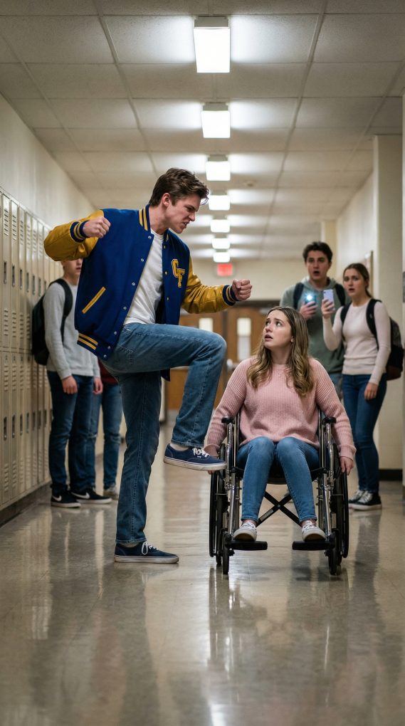 He laughed as he kicked her crutches away, sending her crashing onto the crowded hallway floor while phones lifted to record. “What’s she going to do about it?” he mocked. She didn’t cry—she just looked toward the entrance. Seconds later, the double doors slammed open, and the color drained from his face when he saw who was striding down the corridor.