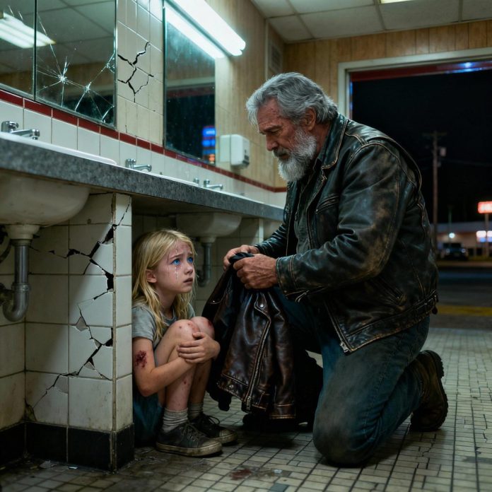 Jack followed the sound. When he pushed open the restroom door, his breath caught. Huddled in the corner beside the sink was a little girl, maybe nine or ten, her knees pulled to her chest. Her face was smeared with dirt, and her arm bore a dark bruise the size of a man’s hand.