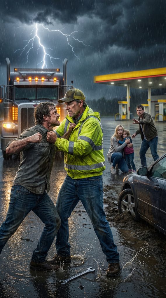 A sedan sat crooked on the shoulder, one front tire sunk in mud where the asphalt crumbled. The hood was up like a surrender flag. A man in a soaked windbreaker tried to shield two kids under a collapsed umbrella while a woman knelt by the rear wheel, shaking as she fought with a jack.