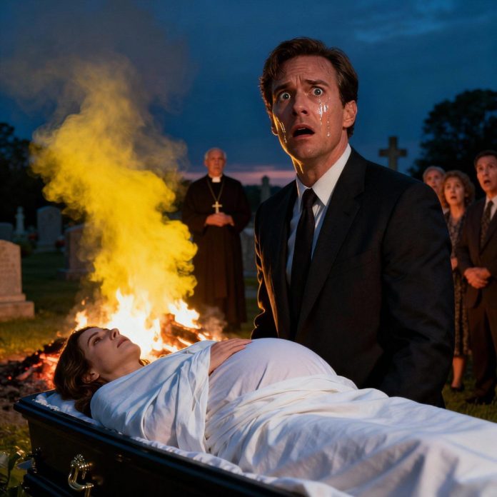 The flames were about to rise when Ethan Miller saw something that froze his blood. His wife, Claire, lay in the coffin, pale and lifeless, draped in white silk, her hands crossed over her chest. She had died two days earlier — or so everyone believed. The doctors had pronounced her dead following a tragic car accident that left her severely injured. She had been six months pregnant.