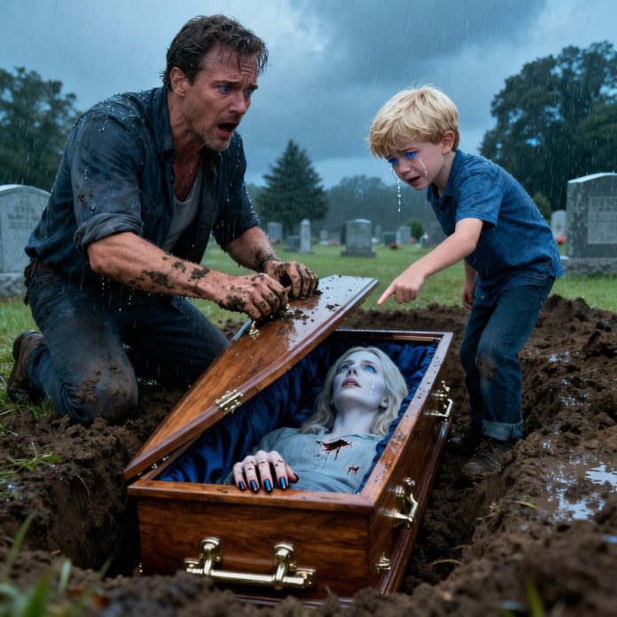 Michael froze. The wind howled between the gravestones, and for a moment, he thought grief was twisting his son’s mind. But then, Ethan screamed — a sharp, terrified cry — and pointed at the freshly covered mound of earth.