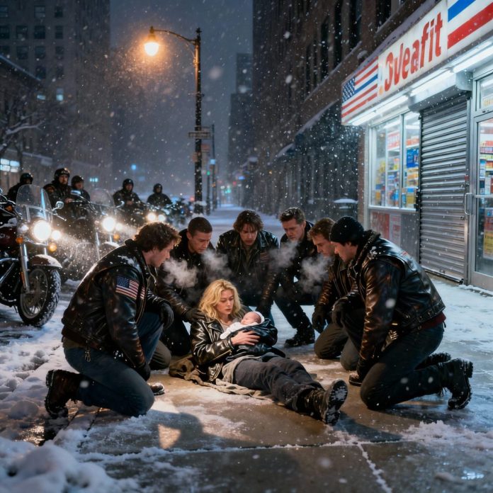 In the middle of a snowstorm, a homeless woman gave birth right on the sidewalk. Ten bikers passing by saw her — and what they did next sent the whole neighborhood into an uproar…