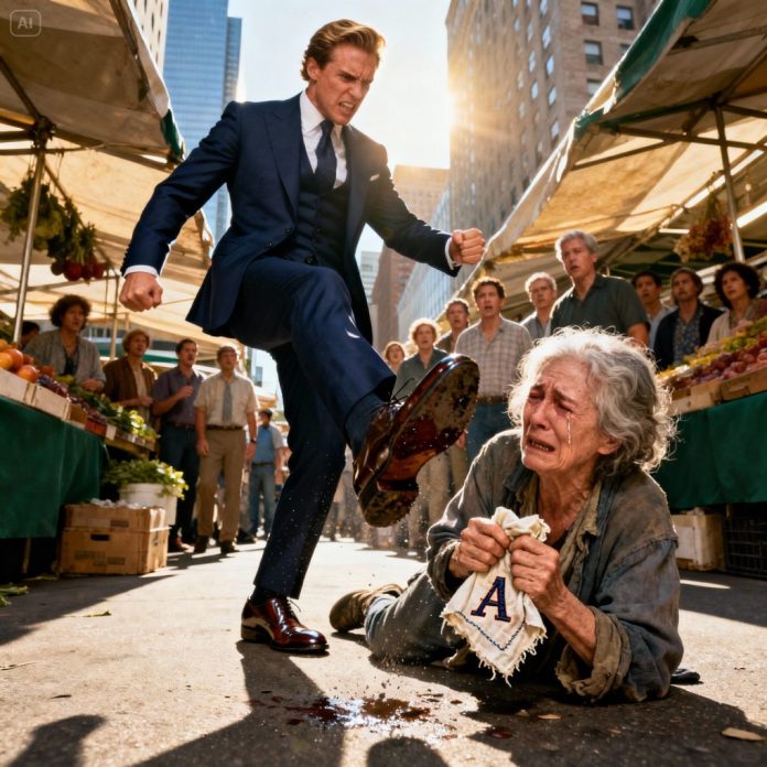 “Watch where you’re going!” he snapped, his tone sharp as glass. With a swift, angry motion, he kicked her aside. The woman fell hard, a crowd gasping in shock.