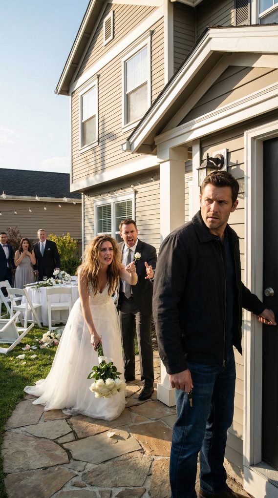 When I finally drove back an hour later, the street looked like the scene of a disaster instead of a wedding. Guests stood in small groups near the driveway whispering to each other. The caterers had set trays on folding tables outside because they couldn’t reach the kitchen. The wedding planner was pacing near the gate, talking anxiously on her phone. And Madison stood in the front yard in her wedding dress, looking furious enough to tear the decorations down herself. The moment she saw my truck pull up, she marched straight toward me. “This is your fault!” she shouted. Chris followed behind her, clearly stressed. “Why didn’t you tell us you were locking the house?” I stepped out of the truck slowly. “Because you didn’t want me here.” Madison pointed angrily at the house. “The bridesmaids need the upstairs rooms!” “The cake is melting in the car!” Chris added. I leaned casually against the truck. “Maybe asking the homeowner to disappear wasn’t the best idea.” Madison’s face turned bright red. “You’re being petty!” I shook my head. “No. I’m following instructions.” The crowd around us had grown quiet, watching the argument unfold like unexpected entertainment. Chris ran a hand through his hair. “Jason, please just unlock the house so we can get this wedding started.” I looked at him for a moment before pulling the keys from my pocket. As I walked toward the door, I stopped and turned back toward them. “Next time you ask someone for a massive favor,” I said calmly, “don’t treat them like they don’t belong in their own home.” I unlocked the door and stepped inside. But by then the damage was already done. The ceremony was hours behind schedule, guests were whispering, and Madison’s carefully planned perfect wedding day had turned into something very different. And as I stood in my own living room, one thought stayed with me: sometimes people only understand respect when they realize exactly how much power they never noticed you had.