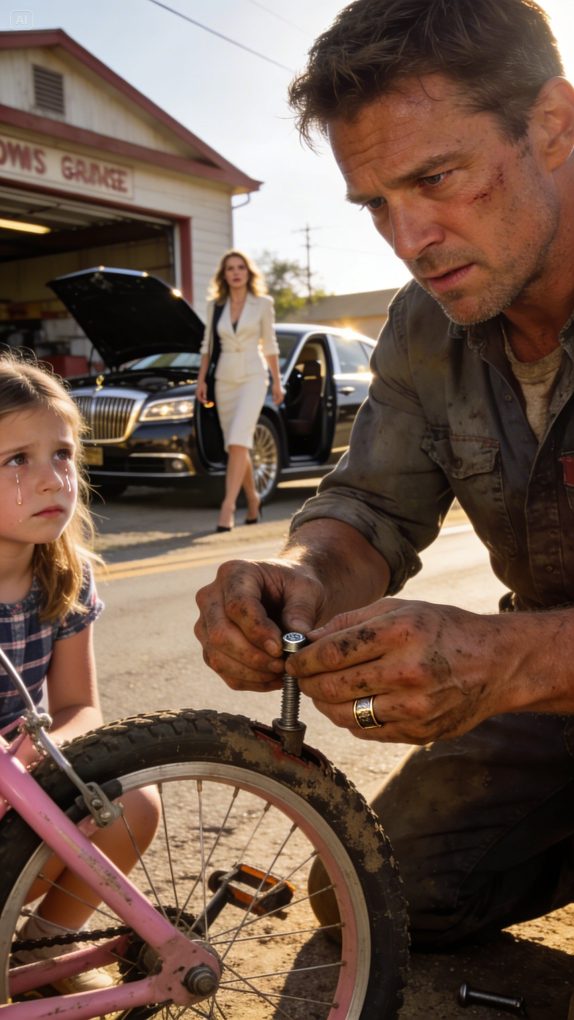 It all started with a broken bike and a little girl’s tears. The main turning point of Ethan Cole’s life happened on that quiet afternoon in his dusty garage on Maple Street, and it would circle back months later in a way so shocking that even he would question whether fate had been quietly watching. Ethan was not a remarkable man by society’s standards. He was forty-two, divorced, living alone in a rented apartment above a closed bakery, and barely keeping his garage afloat. His hands were permanently stained with grease, and the calluses on his palms were thicker than his savings account. The garage had once belonged to his father, and letting it fail felt like betraying blood. That September afternoon, a little girl named Lily Harper walked in, pushing a bicycle with a twisted front wheel. Her mother, Claire Harper, followed behind, apologizing for the intrusion. They had just moved into a low-cost rental nearby. Claire’s voice was calm but carried exhaustion. Lily’s bike had been hit by a car that didn’t stop. It was her only possession she truly loved. Ethan examined the damage: bent rim, cracked fork, severed brake cable. The repair would cost more than they could afford. Claire admitted she had lost her job recently and was waiting for something new to come through. Ethan looked at the child’s red eyes and made a choice without calculation. He told them to leave the bike. He worked late into the night, salvaging parts from abandoned frames, welding the fork, straightening the wheel with patient precision. The next morning, when Lily saw her restored bike gleaming under the garage lights, she hugged Ethan tightly. Claire tried to pay him twenty dollars; he refused. It felt like a small act, barely worth mentioning. But the main event had already been set in motion. Three months later, Ethan received a foreclosure notice. He had thirty days to clear his debt or the bank would seize the garage. On the twenty-ninth day, as he stood inside contemplating which tools to sell first, a black luxury sedan rolled slowly onto Maple Street. It stopped in front of his shop. The engine cut. The driver stepped out, then opened the rear door. Claire Harper emerged, no longer dressed in discount-store denim but in a tailored coat, composed and unreadable. Ethan’s confusion turned to disbelief when two men in suits followed her. She held a folder in her hands. The woman he thought was struggling was not who she claimed to be. And when she said, “Mr. Cole, we need to talk about what you did for my daughter,” he felt the ground shift beneath him, unaware that this conversation would expose a truth far darker and far more life-altering than simple gratitude.