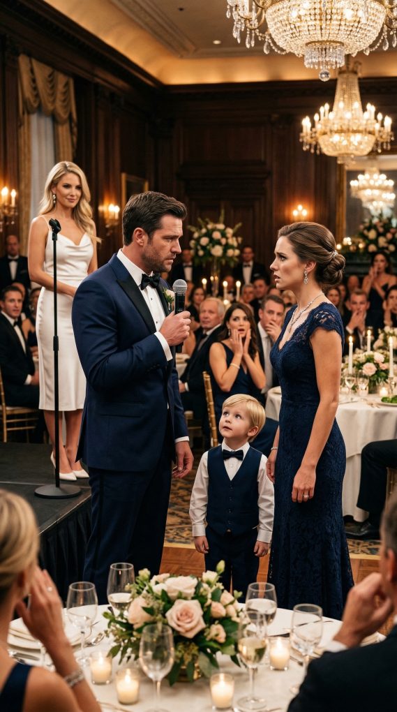 Weddings have a way of compressing time. For a few hours everything feels suspended between celebration and memory, the air thick with music, perfume, and carefully practiced smiles. My sister’s reception took place in a wide ballroom with tall glass windows overlooking the city lights. White linen covered every table, and the soft glow of candles reflected in hundreds of glasses scattered across the room. Guests laughed easily that night, fueled by champagne and the comfortable assumption that weddings were meant to be joyful. I sat near the edge of the room with my five-year-old son beside me, his small fingers wrapped tightly around mine as he watched the band setting up for the next song. My sister had always loved attention, and tonight she moved through the crowd like someone who had rehearsed every step. The moment dessert plates were cleared, she stood and tapped her glass gently with a fork. The microphone was already waiting on the small stage behind her. “Before we dance,” she said brightly, “I want to say a few words.” Her voice carried easily through the speakers. Guests leaned back in their chairs, smiling. Daniel—her new husband—stood beside her, one arm resting casually around her waist. She began with the usual wedding speech details: childhood stories, thank-yous to friends, sentimental remarks about love and family. People laughed at the right moments. They clapped politely when she spoke about her new life ahead. Then her eyes drifted toward my table. I felt my son’s hand tighten slightly in mine. “Of course,” she continued lightly, “I also have to thank my older sister.” A few heads turned in my direction. I smiled politely. “She taught me a lot growing up,” my sister went on. “Mostly about what not to do.” The room chuckled softly. I forced a small laugh along with everyone else. “I mean,” she added, tilting her head toward me, “raising a kid alone really showed me the importance of making better choices.” The laughter grew louder. My son shifted closer to me, confused by the noise around us. “But hey,” she continued, raising her glass slightly, “at least she gave us a cautionary example.” The ballroom erupted with laughter now, the kind that rolls through a crowd when people believe they’re witnessing harmless humor. I felt the sound hit my chest like pressure. My son looked up at me, eyes wide. “Mom?” he whispered quietly. I squeezed his hand gently. My sister leaned into the microphone again. “So tonight,” she said with a playful smile, “let’s celebrate the family members who get it right.” The laughter swelled one more time. I stayed still in my chair, still holding my son’s hand. And then something unexpected happened. Daniel slowly stood up. He reached toward the microphone. The ballroom fell so quiet I could hear my five-year-old swallow beside me.