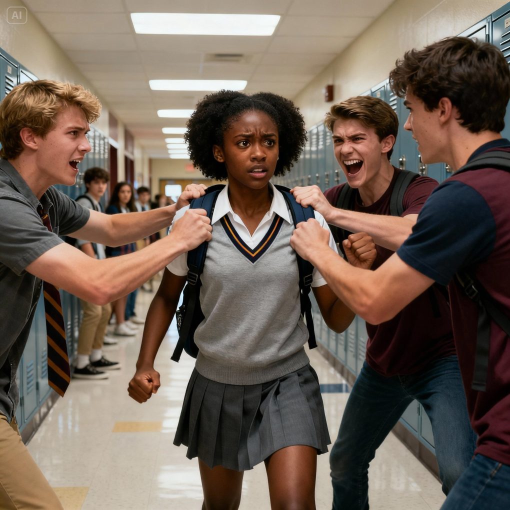 By her third week at Ridgeway, some students began targeting her. They whispered racial slurs, mocked her curly hair, and called her names she’d long learned to ignore. But that day, it escalated. During lunch, a group of three boys — Trent, Kyle, and Mason — cornered her near the back of the cafeteria. One of them grabbed her tray, spilling food across her shirt, and sneered, “Smile for us, chocolate girl.” The others laughed. When Ava tried to walk away, Kyle reached out and touched her arm inappropriately.