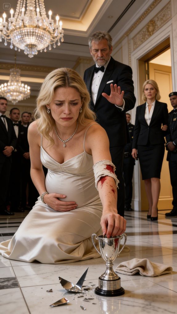 “Never correct me in front of other people again,” the millionaire snarled, then hurled the silver trophy at me—just because I said that painting was a fake. I clutched my pregnant belly as blood ran down my sleeve. The entire banquet hall fell deathly silent. I didn’t cry. I simply picked up a shard of the trophy, wiped it clean of fingerprints, and sent a photo to Legal: “Activate the $50 million indemnity clause.” Ten minutes later, the company’s accounts flashed red with an emergency alert. He sneered… until the person who had signed the freeze order appeared in the doorway..