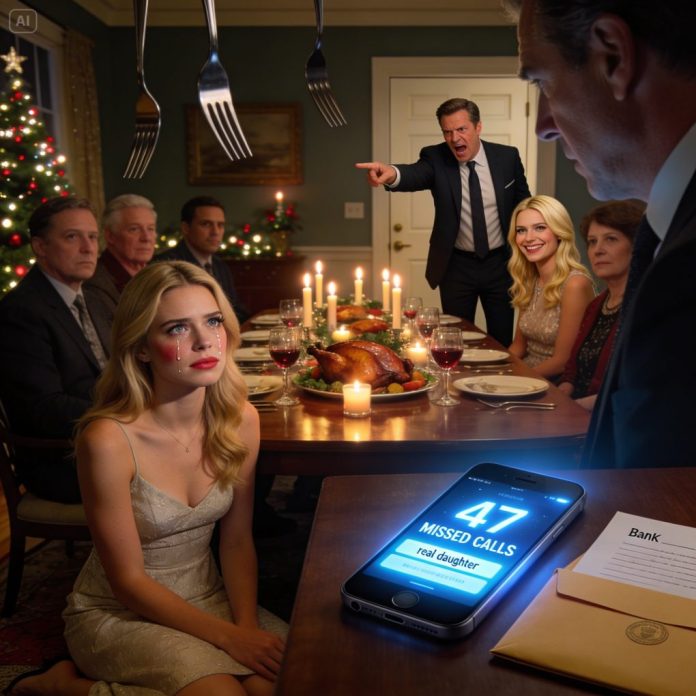 Christmas at the Whitmore house was always staged like a photograph: perfect plates, perfect candles, perfect laughter that started only after my stepfather entered the room. Derek Whitmore loved tradition the way he loved authority—rigid, loud, and designed to remind everyone who was in charge. The dining table glittered with silverware and pine garlands, and every chair had a name card… except mine. I was twenty-six, and I’d been “temporary” in Derek’s home since I was fourteen. Temporary like a coat left on a hook too long. His “real daughter,” Alyssa, sat beside him in a red velvet dress, smiling as if the house itself belonged to her. She swirled her wine and watched me with the same amused contempt she’d worn since she realized Derek would always choose her comfort over my dignity. My mother had died eight months earlier, and the grief still sat in my ribs like a bruise. Derek used that grief like a leash. “Your mother would want peace,” he’d say whenever he wanted silence. I had barely set down the dessert platter when Derek’s hand slammed onto the table. “Not there,” he barked, pointing at the chair near the head. “That seat is for my real daughter—get out.” Every conversation froze. Forks hovered. Someone’s forced laugh died mid-breath. I stood there holding a plate, blinking as if the words hadn’t connected to reality yet. “Derek,” I said quietly, “there’s nowhere else.” He shoved me. Not a dramatic punch—just a hard, contemptuous push meant to move me like furniture. My hip struck the chair, my balance snapped, and I hit the floor in front of the whole family. The sound wasn’t loud, but it was humiliating in a way that made the room seem too bright. Alyssa covered her mouth, not in shock—barely hiding a grin. Derek looked down at me like I’d spilled something. “Get up,” he snapped. “Don’t you dare ruin Christmas with your theatrics.” I could have cried. I could have screamed. I could have begged someone—anyone—to say, “Stop.” But I knew this family’s pattern: they didn’t intervene when Derek was cruel. They waited to see who would win. So I stood up slowly, picked up the plate, and said nothing. No argument. No apology. I walked out of the dining room with my hands steady and my face calm, even though my chest burned. Because Derek didn’t know what I knew. He didn’t know that my mother had trusted me with more than memories. He didn’t know that later that night, after everyone went to bed believing I would cry alone, I would make one decision that would change his life forever. And when he woke up the next morning, his phone would show 47 missed calls—and not one of them would be from someone offering help.