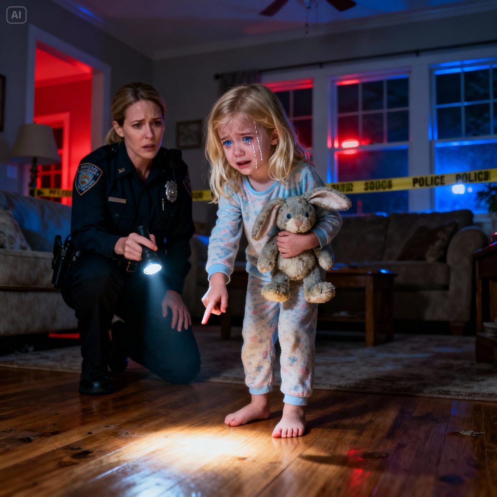 Inside the Harris home, the scene appeared normal — too normal. A half-eaten dinner sat on the table, and a television murmured a late-night commercial. But something in the air felt wrong — metallic, heavy. Claire’s flashlight swept across the wooden living room floor. That’s when Emily pointed. “He’s right there,” she whispered, pressing her tiny hand to the boards.