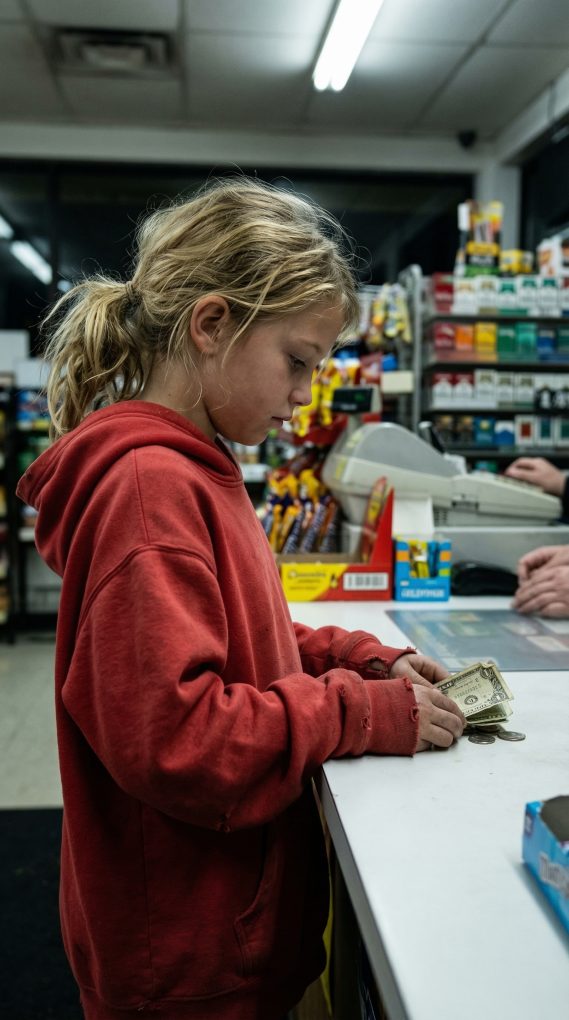 At 10:18 p.m., a nine-year-old girl in a torn red hoodie stepped up to the gas station counter and carefully laid down a wrinkled dollar bill, her fingers trembling as she smoothed it flat. The clerk barely looked up—but the biker in the corner did. When he noticed the shaky words written across the bill, he didn’t finish his coffee. He stayed. And that decision changed everything that night.