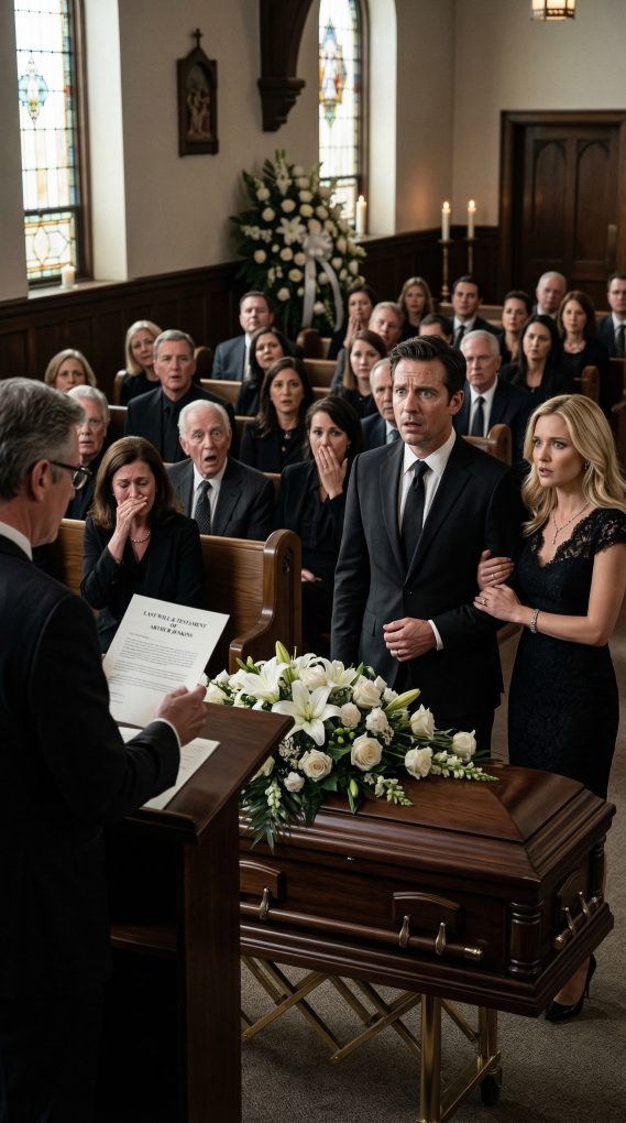 Michael Harper carefully closed the folder for a moment before looking directly at me again. The silence in the chapel had become unbearable. Even the soft music that had been playing earlier had stopped, leaving nothing but the quiet breathing of the crowd. “Emily Carter anticipated that her husband might attempt to inherit her estate,” the lawyer said calmly. “Therefore, she made specific legal arrangements to prevent that from happening.” I felt the ground beneath my feet begin to shift. Vanessa stood a few steps away now, clearly distancing herself from me. The lawyer continued reading. “Under the terms of Emily Carter’s will, if her husband Daniel Carter is proven to have committed marital misconduct, he will receive nothing from her estate.” A ripple of whispers moved through the room again. My mouth felt dry as the lawyer continued. “Instead, her entire estate—including the house, financial accounts, and business investments—will be transferred into a protected trust fund for her unborn child.” Rachel covered her mouth as tears rolled down her face. Emily’s parents, seated quietly in the second row, held each other’s hands. I suddenly realized what Emily had done. She had known. Not just about Vanessa—but about everything. And she had prepared for it. “Furthermore,” the lawyer added calmly, “Emily Carter requested that the documentation of her husband’s actions be submitted to the court should any legal dispute arise.” My chest tightened. What I had believed would be a quiet funeral had turned into something completely different. The crowd that once pitied me now stared with open judgment. Vanessa slowly stepped away from me entirely, her expression filled with regret. “You told me your marriage was already over,” she said quietly before turning and walking toward the exit. I stood alone beside Emily’s coffin while the lawyer finished closing the folder. In the end, the funeral had not only buried Emily. It had buried the future I thought I had secured for myself. And Emily, even in death, had been the one who planned every second of it.