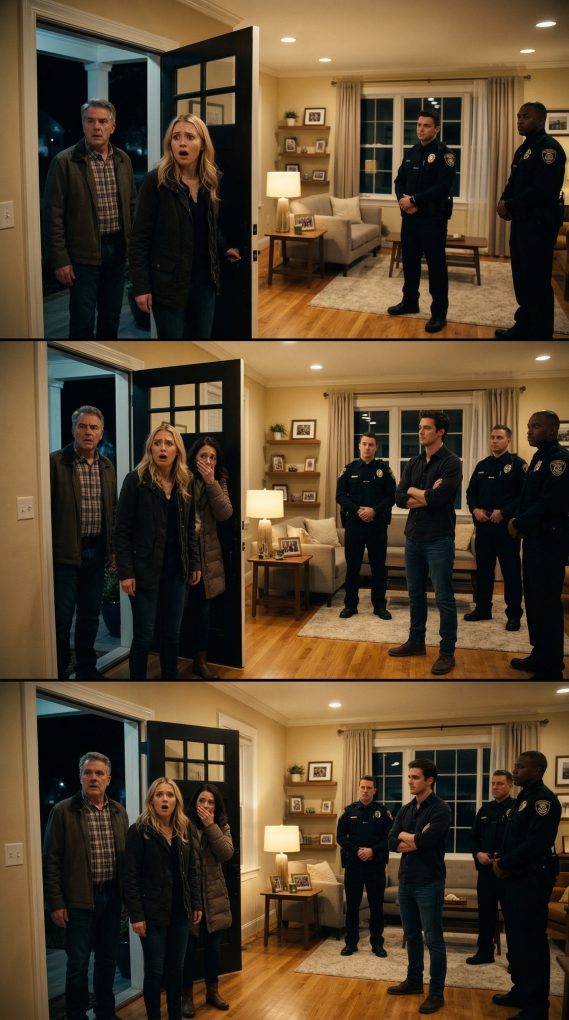 My heart beat faster as I watched the screen in the dim hotel room. The three people quietly stepping into my house were exactly who I expected. My father Richard entered first, moving carefully as if he were afraid someone might be watching. My mother Linda followed behind him, closing the door softly. Sophie came last, carrying a small backpack. She immediately whispered that they needed to move quickly before any neighbors noticed them. My father walked toward my office while my mother began checking drawers in the living room cabinet. Sophie seemed to know exactly where to go. She headed directly toward the hallway where my desk and safe were located. Watching them move through my home like intruders felt strangely unreal. For years they had told everyone that family loyalty meant everything to them. Now they were searching through my belongings looking for the inheritance documents. My father finally reached the locked cabinet in my office. He pulled a small toolkit from his jacket pocket and began trying to open the lock. My mother nervously asked if the papers might already be hidden somewhere else. Sophie whispered that destroying the will or replacing the documents could eventually allow them to claim the estate together. Their conversation continued for several minutes as they discussed what they planned to do once the property belonged to them. Listening to them speak so casually about stealing from me confirmed everything I had suspected. Finally my father forced the cabinet door open. He pulled it wide and leaned inside, expecting to find the legal papers he had been searching for. Instead the entire room suddenly lit up with bright overhead lights. My father jumped back in shock. My mother gasped loudly. Sophie froze in place. Standing calmly in the middle of the room were two police officers and a man holding a folder of documents.