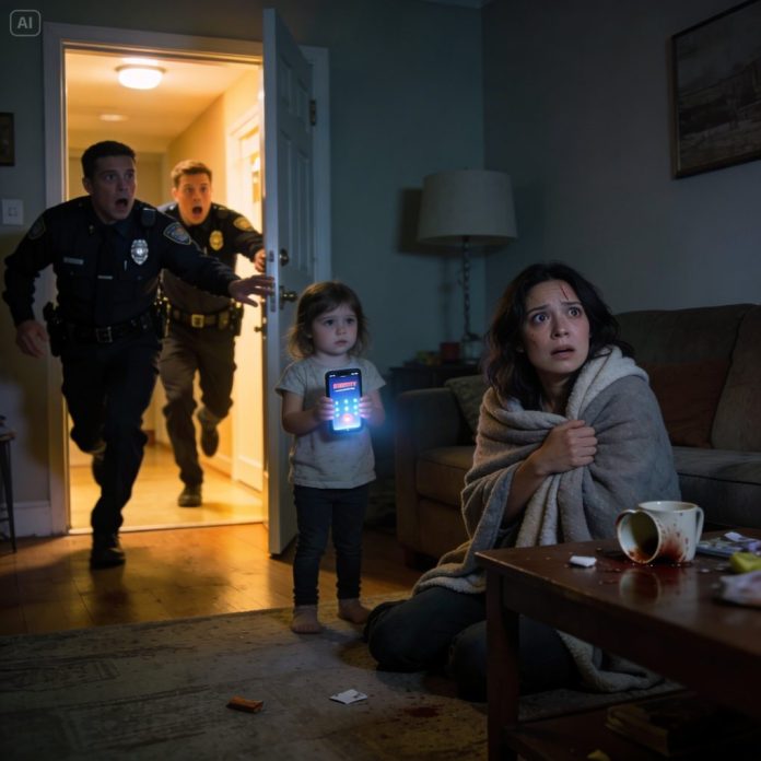 Hannah didn’t teach her four-year-old a “signal” because she was paranoid. She taught it because Mark Reynolds had trained their home to feel like a courtroom where he was judge and jury. In public he was charming; in private he counted every grocery receipt, called Hannah “ungrateful,” and punished her with silence that turned to rage without warning. The first time he yanked her by the hair, Hannah told herself it was stress. The second time, when Sophie screamed and Mark barked, “Shut her up,” Hannah saw something worse than fear in her child’s eyes: recognition. The next morning Hannah called her father, Richard Carter, while Mark was out, and kept her voice steady. “If I touch my necklace twice,” she said, “Sophie calls you. If she calls, you call the police.” Richard didn’t ask for a story. He just said, “Done.” For a few days, Mark acted sweet. He even joked at dinner, kissed Sophie’s forehead, and Hannah almost believed she’d imagined the danger. Then he found the hospital bill she’d hidden—follow-up tests for Sophie’s asthma—and his face went flat. “You’re trying to ruin me,” he hissed. Hannah backed toward the hall, but he grabbed her hair and dragged her into the kitchen. Sophie stood in the doorway, frozen. Mark shoved Hannah down. Her leg twisted under her, and pain detonated through her body so sharp she couldn’t breathe. She hit the tile hard, mouth filling with blood where her teeth split her lip. Mark loomed over her, chest heaving, and sneered, “Stop pretending you’re weak. You’re not leaving me.” Hannah couldn’t stand. She couldn’t even scream without coughing. So she did the only thing left: she lifted one shaking hand and tapped her necklace—once, twice. Sophie’s gaze snapped to hers. The little girl didn’t argue. She sprinted to the side table where an old phone Hannah kept “for cartoons,” punched in four numbers she’d practiced like a nursery rhyme, and pressed speaker. “Grandpa,” Sophie cried, voice steady with terror, “Mom looks like she’s about to die!” Mark’s head whipped around. For one stunned second he didn’t understand. Then his expression sharpened into panic. He lunged for the phone. Hannah dragged herself between him and Sophie, fingertips scraping the floor, and that was when the sirens rose outside—fast, close—followed by heavy fists hammering the front door.