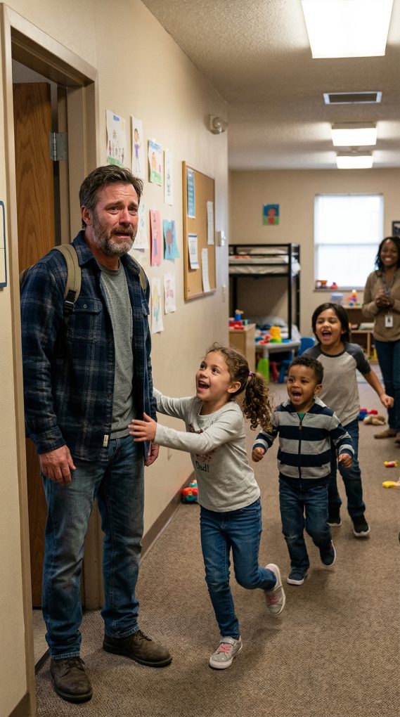 Daniel had expected the visit to feel awkward. He imagined standing quietly near the door while the staff introduced him as the volunteer who read stories over the phone. Maybe a few shy smiles from the children. Maybe a polite thank-you before everyone returned to their routines. Instead, the moment he stepped into the room, chaos erupted. A little boy near the back looked up first. His eyes widened. “It’s him!” he shouted. Several heads turned immediately. Then the entire group of children seemed to recognize something all at once—not Daniel’s face, which they had never seen before, but the sound of his voice when he greeted them. “Hi everyone,” he said softly. That was enough. The room exploded with movement. Chairs scraped across the floor as children jumped up and ran toward him. “Dad!” one girl shouted. “Dad’s here!” Another boy grabbed his arm. “You came!” Daniel froze in the doorway, completely overwhelmed as half a dozen kids clung to him at once. “Wait,” he said gently. “I think there’s a misunderstanding—” But the children weren’t listening. They were laughing and talking all at once, tugging on his sleeves, pointing excitedly toward the bookshelf where the same stories he had read sat stacked together. The shelter coordinator stepped beside him, smiling quietly. “They call every volunteer something different,” she explained softly. “But with you… they all chose the same word.” Daniel looked down at the children surrounding him. Some were barely four or five years old. Others looked closer to ten. Many had lived at the shelter for months while their parents struggled to rebuild stable housing. A few had fathers who worked far away. Some had fathers who had simply disappeared. But every night, without realizing it, Daniel’s voice had filled the silence before they fell asleep. One little girl with curly hair tugged his sleeve. “Are you reading tonight too?” she asked. Daniel swallowed, trying to steady the emotion suddenly pressing against his chest. “Of course,” he said quietly. The children cheered and dragged him toward the circle of chairs near the bookshelf. As he sat down and opened the familiar storybook, the room slowly settled again. But this time, instead of hearing only their voices through a speakerphone, Daniel could see them leaning forward eagerly, their eyes bright with anticipation. And for the first time since he began volunteering, he realized something he had never considered before. To them, his voice hadn’t been just a bedtime routine. It had been something much bigger.