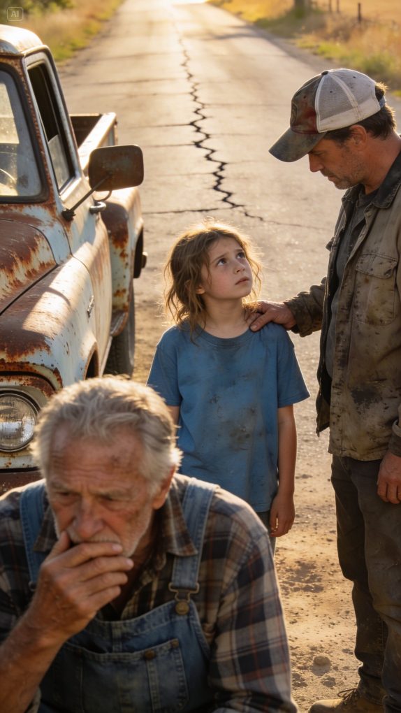 I was seconds away from walking outside and telling the rusted pickup truck to get off my driveway. It had been sitting there all morning, engine idling like it had no intention of leaving. My name is Thomas Calder, and I run a small auto repair shop out of a converted garage behind my house in a quiet town in western Pennsylvania. Nothing fancy—just a few lifts, a wall of tools I’ve collected over thirty years, and a reputation around town for fixing things people thought were too broken to bother with. The pickup had pulled in just after eight that morning. I noticed it through the front window while drinking my first cup of coffee. It was an old Ford from the late 90s, the kind of truck that had clearly lived a hard life—rust spreading along the doors, one headlight fogged over, a dent in the tailgate that looked like it had been there for years. What bothered me wasn’t the truck itself. I see beat-up vehicles every day. It was the way it just sat there. The engine kept running, but nobody got out. Twenty minutes passed. Then forty. By the time an hour had gone by, I started wondering if something strange was going on. These days, when a vehicle lingers too long in your driveway without explanation, your mind runs through possibilities that have nothing to do with car trouble. I finally set my mug down and walked toward the front door, ready to step outside and ask whoever was inside what they needed. Maybe they were lost. Maybe they thought my driveway was somewhere to park while making a phone call. Either way, the polite thing would have been to knock on the window and ask. I grabbed my jacket and stepped onto the porch. The morning air was cool, carrying the smell of damp grass from the yard. The truck’s engine hummed softly, a tired mechanical rhythm that suggested it probably shouldn’t have been idling that long. I took a few steps toward it, rehearsing the words I planned to say. Something firm but not rude. Morning. Can I help you with something? But before I reached the driver’s side, the passenger door creaked open. A tiny girl climbed out. She looked about eight years old—small, thin, wearing a pink hoodie that was slightly too big for her and sneakers with the laces loosely tied. She stood there for a moment, looking around like she was making sure she had come to the right place. Then she spotted me. Without saying a word, she walked up the driveway toward me, holding a piece of paper in her hand. It was crumpled like it had been folded and unfolded a dozen times. When she reached me, she held it out with both hands. “My dad told me to give you this,” she said quietly. I took the note and unfolded it. The handwriting was rough, written with what looked like a dull pencil. It said only one sentence: