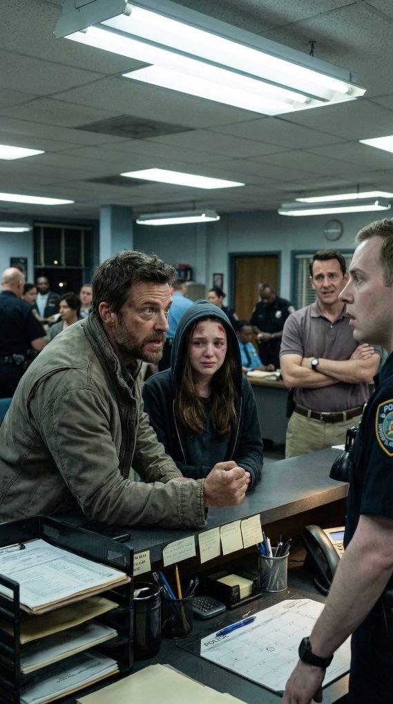 My name is Daniel Brooks, and the call that came at two in the morning changed everything I thought I knew about my daughter’s life. I was asleep in my small apartment in Seattle when my phone started ringing nonstop. Half awake, I almost ignored it, but when I saw the name on the screen, my chest tightened. It was my fourteen year old daughter, Lily. She never called that late unless something was terribly wrong. The moment I answered, I could hear her breathing unevenly. She sounded terrified. Her voice trembled as she said she was at a police station downtown. For a second I thought she was joking or that I had misunderstood her. But then she whispered the words that made my blood run cold. She said her stepfather, Jason, had hurt her during an argument. But now he was telling the police that she had attacked him first. Even worse, she said the officers seemed to believe his story. Lily had been living with her mother and Jason for the last two years after my divorce from her mom. I had always tried to trust that things were stable in that house, but something about Jason had never sat right with me. Hearing Lily’s voice that night erased any doubt. I grabbed my car keys, barely remembering to lock the apartment as I ran outside. The streets were empty and silent while I drove across the city. Every red light felt like it lasted forever. By the time I reached the police station my heart was pounding so hard it felt like it might burst through my chest. I pushed through the front door and saw Lily sitting at a desk across the room. Her eyes were red and swollen from crying. When she saw me, she stood up immediately and ran over, clinging to me as if she had been holding her breath for hours. Behind her stood Jason, leaning casually against a wall while speaking with another officer. His expression looked confident, almost amused. I walked up to the front desk and said my daughter had called me. The officer on duty glanced up at me, then suddenly froze. His face slowly turned pale as if he had just realized something important.