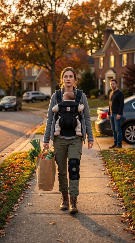 It was a gray afternoon when my father saw me. The sky hung low over the street, the kind of dull, colorless sky that makes everything feel heavier than it should. I had just come out of the small grocery store on the corner, my baby balanced awkwardly on my left hip while my right arm struggled to hold three heavy grocery bags. The plastic handles dug into my fingers so deeply they had already turned red and numb, but I kept walking anyway. I had learned to ignore that kind of discomfort. When you become a single parent at twenty-six, you get used to ignoring a lot of things—aches, exhaustion, hunger, even your own worries. Across the street, my father had just stepped out of a small hardware store. I didn’t notice him at first. My attention was on the uneven sidewalk and the restless weight of my daughter shifting in my arms. But he noticed me immediately. Later he would say he recognized my walk before he even saw my face. Parents know those things. He froze on the sidewalk for a moment, staring. From where he stood, he could see everything I had tried so hard to keep hidden: the dark circles under my eyes, the tension in my shoulders, the way I leaned slightly to one side because my back hurt from carrying the baby so often. I finally looked up and saw him standing across the street. For a second my heart jumped in surprise. Then instinct kicked in. I forced a smile—the kind of quick, automatic smile you give when you don’t want someone to worry. I lifted my hand slightly as if everything was completely fine. But fathers have a strange ability to see through those smiles. Even from the other side of the road, he knew immediately something wasn’t right. Without hesitation he stepped off the curb and hurried toward me. Cars slowed as he crossed, but he barely noticed them. When he reached the sidewalk in front of me, his eyes moved quickly over everything I was carrying—the baby, the groceries, the exhaustion on my face. “Give me the bags,” he said quietly, already reaching for them. I tried to protest automatically. “Dad, it’s okay. I’ve got it.” But he didn’t listen. He gently took the grocery bags from my hand and shifted them easily into his own. My fingers tingled painfully as the circulation returned. Then he looked directly at my face, not the quick glance people give out of politeness, but the kind of careful look only a parent gives. For a moment neither of us spoke. I tried to hold that smile a little longer, but I could feel it fading. My daughter reached for his glasses curiously, and he smiled at her before looking back at me again. “You’re tired,” he said softly. It wasn’t a question. It was the quiet certainty of someone who already knew the answer. I swallowed and shook my head lightly. “Just a long day.” But the truth was already written all over my face. And in that moment, standing there on the sidewalk, I realized something important: my father had already seen everything I had been trying so hard to hide.