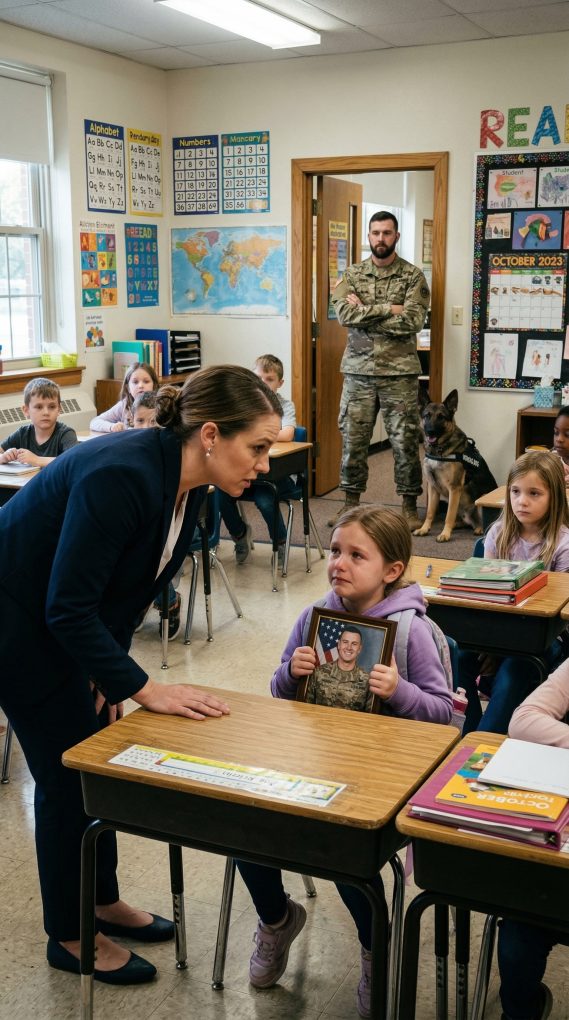 Career Week at Lincoln Elementary was supposed to be a simple event where parents talked about their jobs. Students sat proudly beside posters and presentations about what their families did for a living. Doctors explained how they helped people heal. Engineers brought models of bridges and buildings. Business owners talked about running companies. Eight-year-old Lily Carter had been excited all week because her class was also sharing stories about their parents’ work. When it was Lily’s turn, she stood up beside her desk holding a small photo she had brought from home. The picture showed her father wearing desert camouflage beside a powerful black-and-tan German Shepherd. Her father, Staff Sergeant Marcus Carter, had been a Marine for nearly fifteen years and worked with a specialized military K9 unit. Lily loved telling people about him. “My dad is a Marine,” she said proudly to the class. “And he works with his dog Rex to find dangerous things and protect people.” A few kids looked impressed, but her teacher, Mr. Dalton, reacted differently. Mr. Dalton was known for being sarcastic sometimes, and that morning he seemed particularly irritated. He folded his arms and gave a dismissive laugh. “Just a Marine?” he said loudly. The room grew quiet. Lily blinked, confused. “Well,” Mr. Dalton continued casually, “some parents are doctors and scientists who actually change the world. Being a soldier isn’t exactly the same.” A few children laughed nervously, unsure whether they should find the comment funny. Lily’s small smile disappeared instantly. She lowered the photo slowly and sat down without saying another word. The rest of the day passed quietly for her. But that evening, when Marcus Carter picked his daughter up from school, he immediately noticed something was wrong. Lily usually ran toward him the moment she saw him waiting near the school gate. Instead, she walked slowly with her head down, clutching her backpack straps tightly. Marcus crouched beside her. “What’s wrong, kiddo?” he asked gently. Lily hesitated before answering. “My teacher said you’re just a Marine,” she whispered. Marcus felt something tighten in his chest. “Did he now?” Lily nodded. “He said other jobs matter more.” Marcus stayed quiet for a moment, carefully controlling the anger rising inside him. Marines are trained to remain calm under pressure, and that training had saved his life more than once. But hearing his daughter’s voice tremble was something entirely different. “Did that hurt your feelings?” he asked. She nodded again. Marcus stood up slowly and looked toward the school building. The sun was already beginning to set, and most of the classrooms were empty. But one light still glowed in the hallway near Lily’s classroom. Marcus turned back to his daughter. “Tomorrow,” he said calmly, “we’re going to visit your teacher.” The next morning, the school hallway fell completely silent when Staff Sergeant Marcus Carter walked through the doors wearing his Marine uniform—with Rex, his massive K9 partner, walking calmly beside him. And when he stopped outside the classroom, his voice carried clearly through the hallway. “Apologize to my daughter,” he said firmly. “Right now.”
