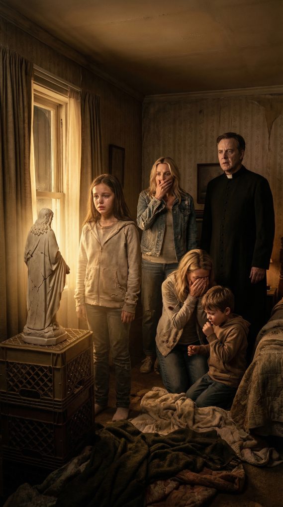 Lily did the only thing that came to her. She dragged the milk crate closer while the priest worked over Mateo’s chest. The statue rocked dangerously once, then steadied. Its cracked face seemed almost stern in the dim apartment light. Mrs. Alvarez pressed her forehead against the plaster base, sobbing prayers in Spanish so fast Lily could not follow them.