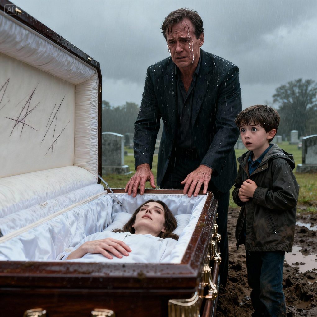 As mourners drifted away, Eli refused to leave. He kept whispering, “Dad, she’s not dead. I heard her.” At first, Mark thought it was just grief twisting the boy’s mind — the kind of desperate hope that grief births in a child. But then Eli grabbed his father’s sleeve and looked up at him with a terrified certainty. “She called my name,” he said. “From the ground.”