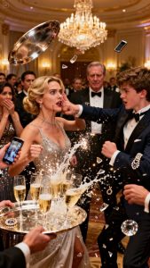 I turned, and Tyler Harlan barreled toward me like a runaway cart. Nineteen, sun-kissed, and smug in a designer suit that cost more than my rent, he didn’t slow down. His hand cracked across my cheek before I could step back. The room seemed to inhale all at once. My tray wobbled, crystal flutes clinking in panic.