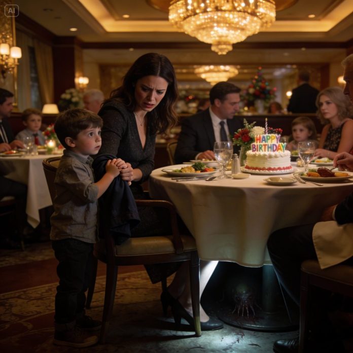 At my mother’s birthday dinner in a fancy restaurant, my five-year-old son, Noah, tugged hard on my sleeve just as the waiter was pouring wine.
