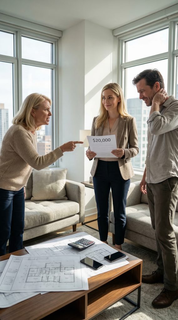 My mother-in-law slid a paper across the table with a smug smile. “Here’s the estimate—$20,000. Since you’re living with my son, be a good girl and pay for renovations in our family home.” I stared at it, then slowly laughed. “That’s funny,” I said, leaning back. “Because your son is living in my apartment.” The room went silent. Then I added quietly, “So let’s talk about what happens next.”