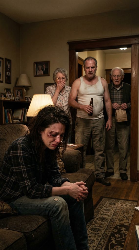 After my husband hit me, my parents saw the bruise on my face, exchanged a quiet look, and walked out without saying a word. He leaned back on the couch with a beer, grinning. “What a well-mannered family,” he mocked.Thirty minutes later, the door opened again.This time I stood up. And when he saw who walked in behind them, the smile vanished—and he slowly dropped to his knees.