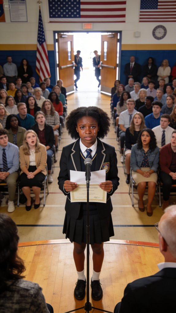 In class, the Black girl was always called “dirty,” forced to sit in the back, and had her backpack searched every time something went missing. The teachers said it was just “discipline,” and her classmates laughed like it was a joke. On auditorium day, she stood onstage to accept an award, and the entire hall was still silent. But when the microphone came on, she didn’t say thank you—she read out loud the remarks that had been recorded in the teachers’ lounge. And then the auditorium doors suddenly swung open…