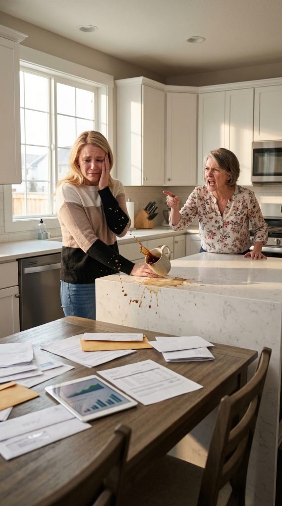 The argument started over money, like it always did in my mother-in-law’s kitchen. My name is Laura Bennett, and for the past three years I had been carrying the entire financial weight of the household. The mortgage, the groceries, the utilities, even my mother-in-law Carol’s credit card bills. My husband, Jason, had lost his job two years earlier, and instead of finding another one quickly, he slowly slipped into the comfortable routine of letting me handle everything. At first I didn’t complain. I loved him, and families help each other. But Carol treated my support like an unlimited bank account. That afternoon I was reviewing our expenses when she walked in and dropped her purse on the table with a loud thud. “Laura,” she said sharply, “I need another five thousand dollars.” I looked up slowly. “Another?” I asked carefully. “You already asked for three thousand last month.” She waved her hand dismissively. “That’s gone. I need more.” I tried to stay calm. “Carol, I’m paying the mortgage, the insurance, and every other bill in this house. I can’t just hand out money whenever you want it.” Her eyes immediately hardened. “Excuse me?” she snapped. “This is my son’s house.” I took a deep breath. “Actually, it’s our house. And I’m the one paying for it.” That was when the tension in the room changed. Carol stepped closer, her face full of anger. “Don’t forget who brought you into this family,” she said coldly. I stood up slowly from the table. “And don’t forget who’s keeping this family afloat.” She grabbed her coffee mug so tightly I thought it might shatter in her hand. “You ungrateful girl,” she hissed. “Five thousand dollars is nothing for someone like you.” My patience finally broke. “No,” I said firmly. “I’m not giving you another cent.” For a second the kitchen went silent. Then Carol’s face twisted with rage. “You think you can talk to me like that?” Before I could even step back, she suddenly threw the mug. The hot coffee exploded across my face and neck. The burning sensation was immediate. I gasped, stumbling backward as tears filled my eyes. Carol didn’t look sorry. If anything, she looked satisfied. I wiped my face with trembling hands and stared straight at her through the pain. “I’ll never forgive you for this,” I said quietly. “And you’re going to regret it.” Then I grabbed my car keys and walked out the door without looking back. Carol believed the argument was over. She thought I would calm down and return like I always did. What she didn’t know was that by the next morning, the life she had been comfortably living in that house was about to disappear.