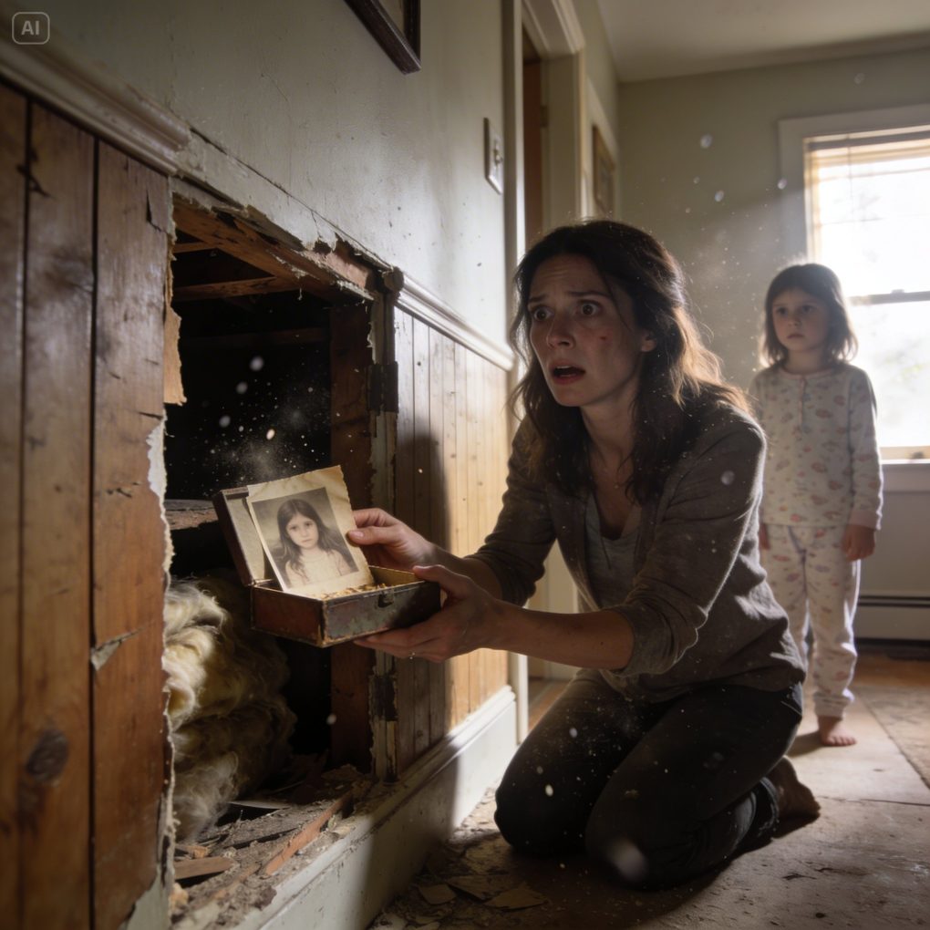 My husband kept insisting that we move into the house his parents had left behind. It looked perfect—until that first night. At 2 a.m., our daughter leaned close and whispered, “Mom… someone is crying in the walls.” I told myself it was only a nightmare. But the next morning, while repairing a loose panel, I found a hidden box inside the wall. It was small. Inside was a photograph… of my daughter, taken years before she was ever born.
