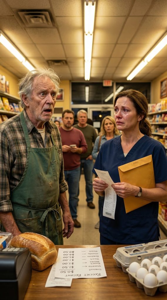 Harold Whitaker was seventy-three years old and had worked the same register at Maple Grove Market in a small Ohio town for nearly fifteen years. Customers liked Harold because he moved slowly but carefully, always greeting people by name when he could remember it. His gray hair was neatly combed, his glasses rested low on his nose, and he had a way of speaking that made strangers feel like neighbors. What most people didn’t notice was the small habit Harold had developed over the years. Whenever someone came to the register and hesitated at the total, he quietly adjusted the numbers. Sometimes it was a dollar or two. Sometimes five. If someone had to put groceries back because they couldn’t afford them, Harold would scan the items again and say, “Looks like this one’s on sale today.” He wasn’t stealing exactly. He simply entered different prices. A cheaper brand code. A discounted produce item. A mistake that looked harmless on a receipt. The store owner rarely checked individual transactions, and Harold’s register balanced well enough to avoid attention. Harold never thought of it as cheating the store. To him it was simply helping people keep their dignity. The first time he did it was for a young mother counting coins while her toddler cried in the shopping cart. The total had been thirty-two dollars. She had twenty-seven. Harold scanned the milk again and said calmly, “Price dropped.” After that, the habit stuck. Over the years he quietly helped dozens of strangers. A retired man choosing between bread and medicine. A college student with barely enough for noodles. A tired father buying groceries at midnight after a double shift. Most of them never realized what Harold had done. Some noticed but never said anything. That was the way Harold preferred it. Kindness worked best when it stayed quiet. On a rainy Thursday afternoon the store was nearly empty. Harold was rearranging gum packs near the register when the door opened and a man walked in wearing hospital scrubs. He looked tired, the kind of exhaustion that came from long shifts and too little sleep. The man walked directly to Harold’s register without picking up any groceries. He placed an old, faded receipt on the counter. Harold adjusted his glasses and glanced down at it. The date printed on the paper was almost twelve years old. “Can I help you find something?” Harold asked politely. The man didn’t answer right away. Instead, he studied Harold’s face carefully. Then he placed a thick envelope on the counter beside the receipt. “Actually,” the man said quietly, “I came to return something.” Harold frowned slightly. “Return what?” The man tapped the old receipt. “A debt you probably don’t even remember.” And in that moment Harold realized the quiet kindness he thought had disappeared into the world… had somehow found its way back.